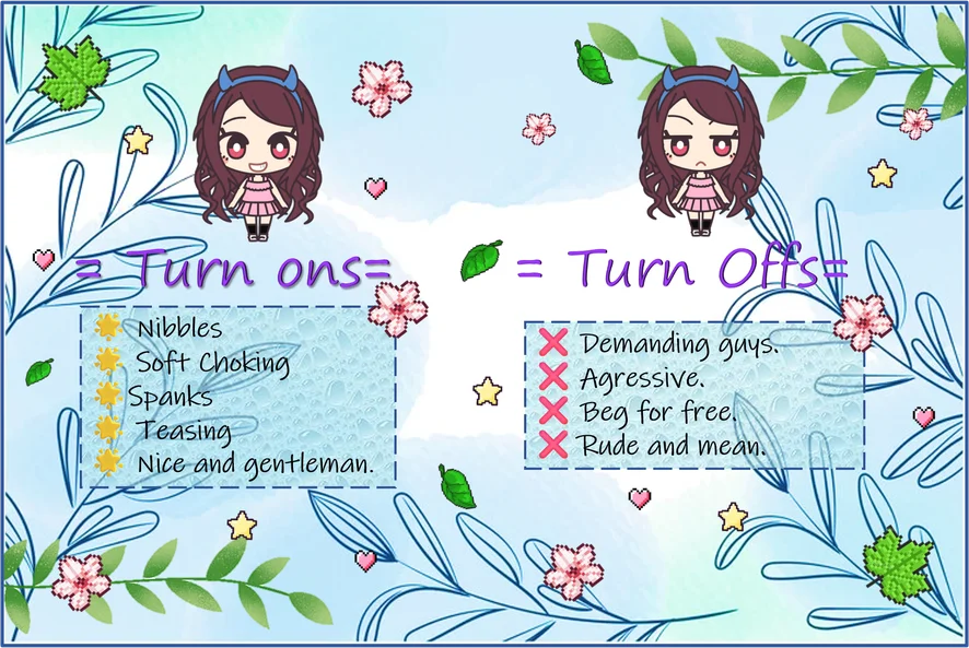 Nhảy Khiêu Dâm, Đánh giá Dương vật, Lộ hàng, Đẩy ngực, Xóc bằng chân, Thổi kèn, Diễn với dầu, Ở trần, Quan hệ kiểu Doggy, Ahegao, Đánh đòn, Ngón chân lạc đà, Xuất tinh, Móc cua, Củ dildo hay Máy rung, Múa Thoát Y, Bú tràn họng, Đóng vai, Đồ chơi Tình dục, Thủ dâm, Cách nói Gợi Dục, Cực khoái, Phụt nước